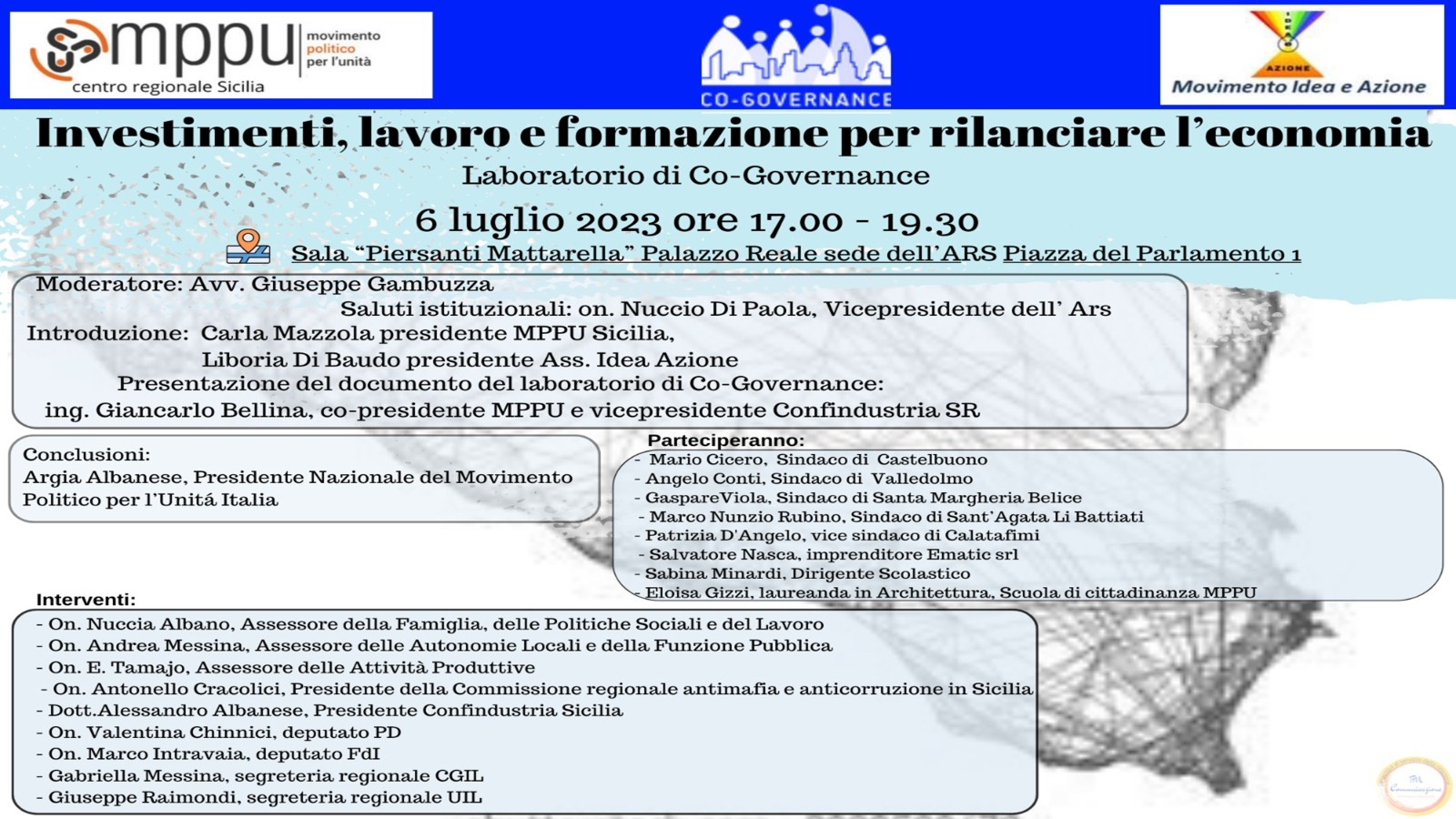 (Si allegano alcune slide tratte dalla presentazione del documento del laboratorio di Co-Governance, presentato dall'Ing.re G. Bellina durante l'incontro i giorno 6 luglio 2023, presso il Palazzo Reale sede dell' ARS, dal titolo "Investimenti, lavoro e formazione per rilanciare l'economia".