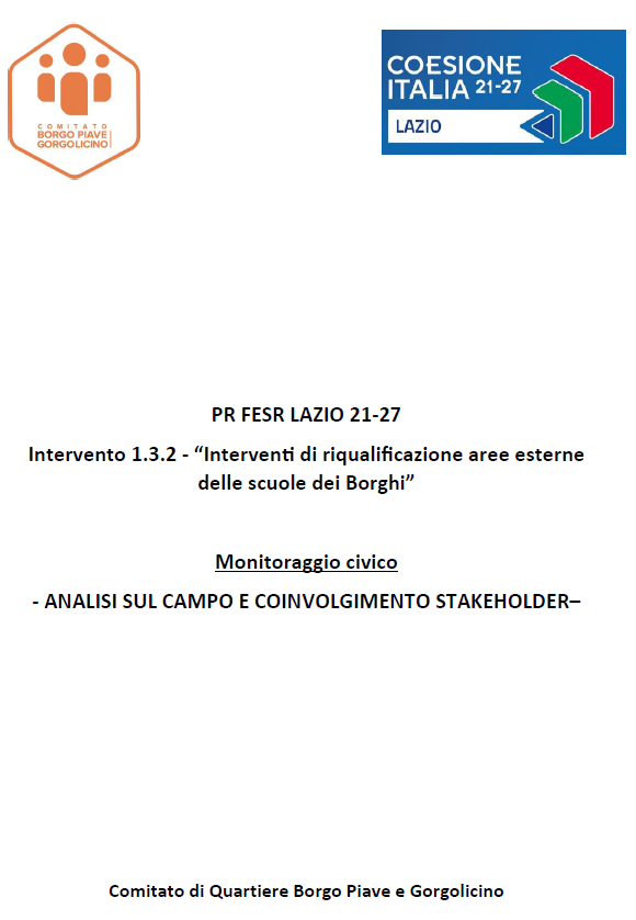 Il progetto si inserisce all'interno del PR FESR 2021-2027. L'idea progettuale iniziale, presentata dal Comitato di Quartiere di Borgo Piave e Gorgolicino nelle prime fasi di partecipazione pubblica del PR FESR, riguardava la riqualificazione dell'area esterna della Scuola dell'infanzia e primaria di Borgo Piave, ma è stato ridimensionato sia dal punto di vista tecnico che economico dal Comune di Latina, quindi esteso alle strutture scolastiche dei borghi e inserito negli interventi previsti nella Fase 1. Il progetto nella sua configurazione finale è stato approvato con la Deliberazione n°336/2024.