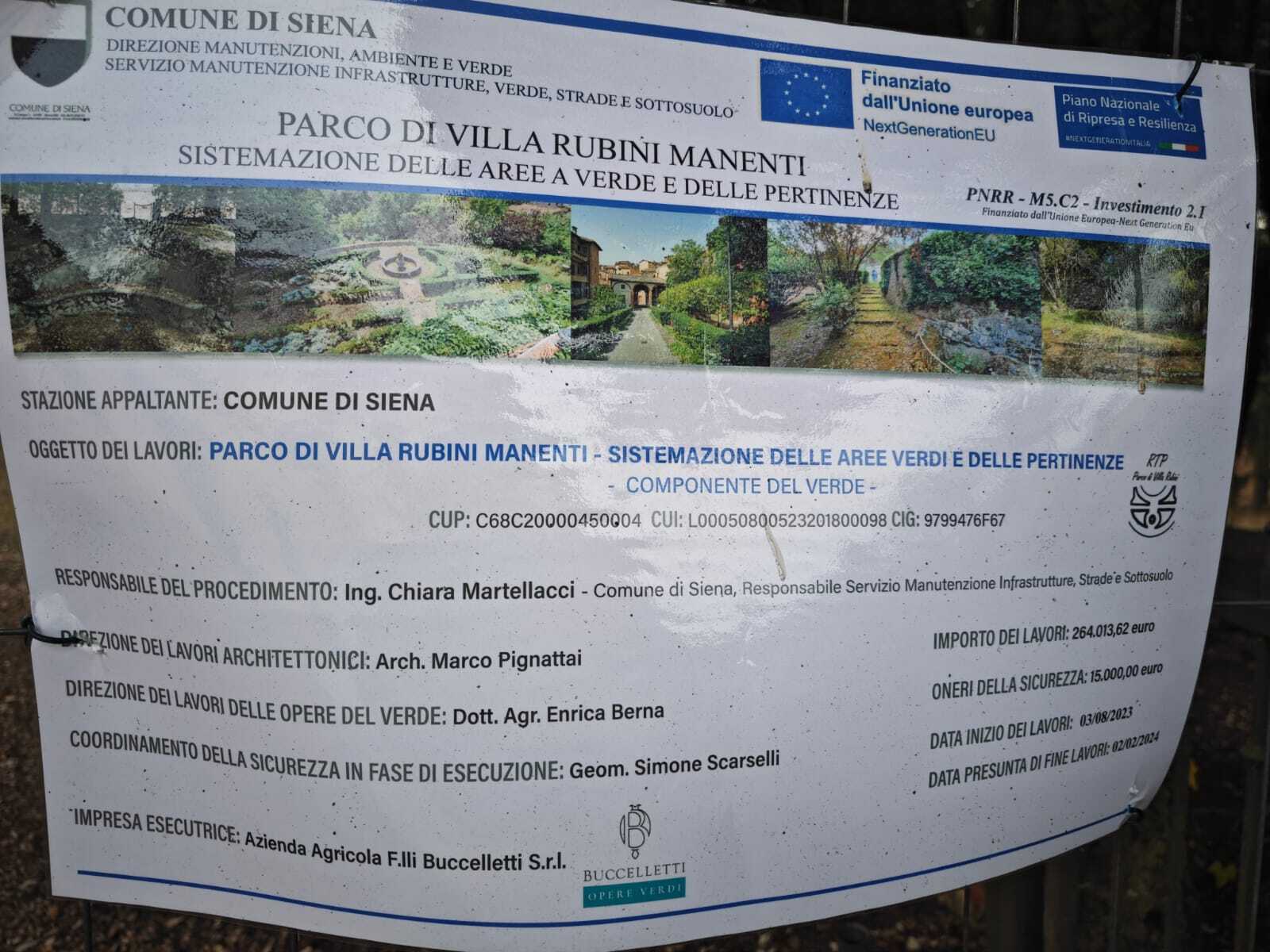 Il progetto “Parco di Villa Rubini Manenti, via degli umiliati n. 12, 53100 Siena, sistemazione delle aree verdi e delle pertinenze”, finanziato con fondi NextGenerationEU del PNRR, riguarda la tematica di rigenerazione urbana ed è volto a ridurre situazione di emarginazione e di degrado sociale. L’oggetto dell’intervento è la realizzazione dei lavori pubblici, in particolare opere ed impiantistica (lotto 1 - componente del verde; lotto 2 - pulizia, ripristino funzionalità fontane e illuminazione del parco). Il soggetto titolare è il comune di Siena e il costo totale è di 1.000.000 euro, di cui 965.602 euro del PNRR. Il progetto è stato avviato nel 2020 ed è ancora in corso.