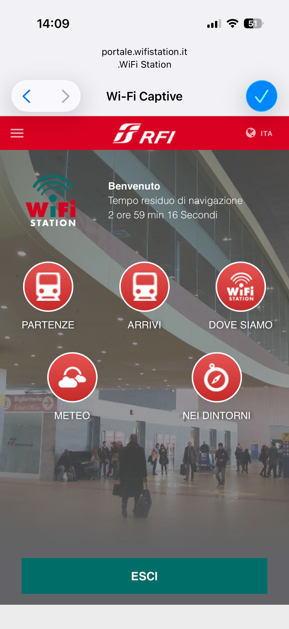 My experience with the Wi-Fi service and information portal at this station is limited. In fact, I was initially unaware that a free service was available, so until recently I had never used it. After discovering that the service existed, I began to inquire about it, and even though I knew I could use it, I never actually did, mainly due to concerns about the security of public connections and the possible exposure of my personal data. I know that some users use the service without any problems, while others, like me, despite being aware of its existence, prefer not to use it because of these concerns. Then there are users who use it regularly, but my personal experience falls somewhere between those who know about the service but don't use it for security and caution reasons.